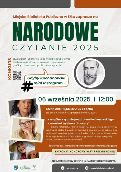 Zapraszamy serdecznie do uczestnictwa w wyjątkowym wydarzeniu, jakim jest Narodowe Czytanie 2025, poświęcone twórczości jednego z najwybitniejszych polskich poetów – Jana Kochanowskiego. Celem akcji jest propagowanie czytelnictwa oraz promowanie rodzimej literatury, a jej finał odbędzie się w sobotę, 6 września 2025 roku, w pięknym Ogrodzie Saskim w Warszawie.