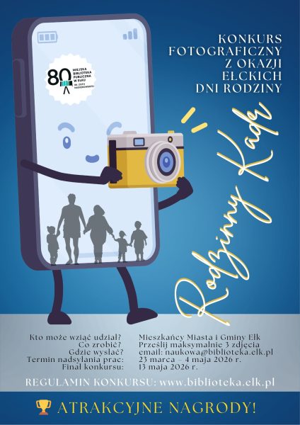 Miejska Biblioteka Publiczna im. Zofii Nasierowskiej w Ełku zaprasza mieszkańców Miasta i Gminy Ełk do udziału w konkursie fotograficznym „Rodzinny kadr”, organizowanym w ramach obchodów Ełckich Dni Rodziny.